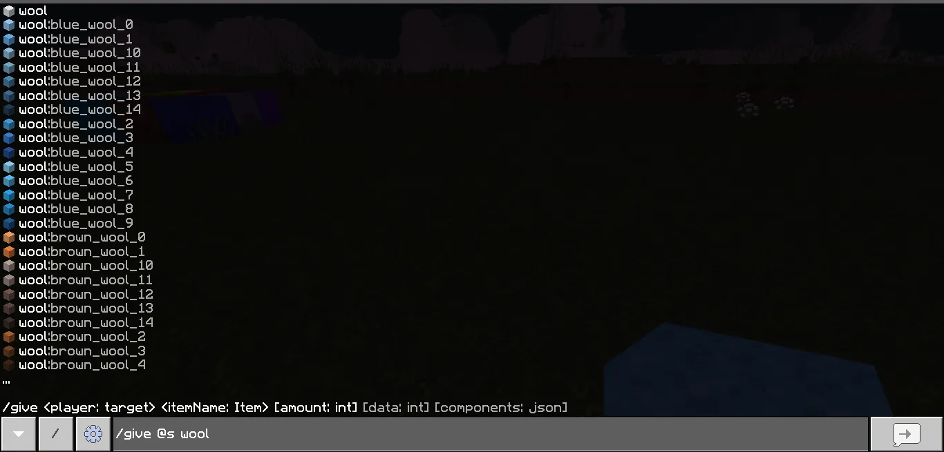 - Команда '/give @s wool: (идентификатор)' - позволяет получить блок определенного цвета и его оттенка;