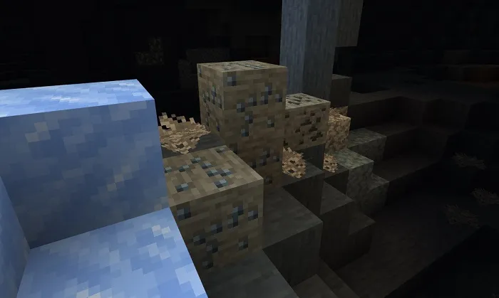 Здесь вы также сможете найти как ванильные руды, так и новые, а около поверхности можно найти голубой скользкий камень.