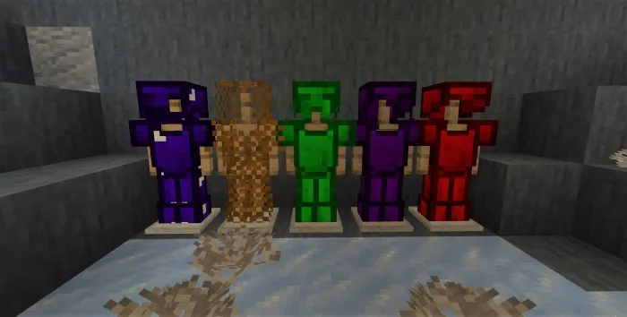 Пока что доступно только 5 видов брони, но в будущем появятся новые виды! На данный момент есть рубиновая, танзанитная, кобальтовая, медная и изумрудная броня. Каждая из них может быть создана из соответствующих материалов.