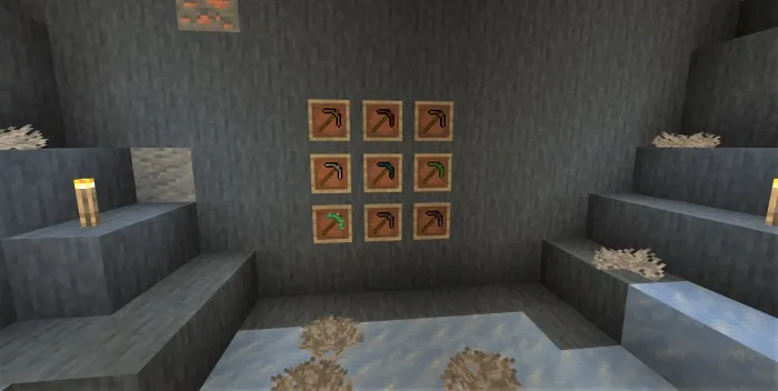 Аддон добавляет 9 кирок, поскольку не все руды используются для их создания. Каждая из этих кирок может быть создана из определённых рудных слитков: никеля, меди, гематита, граната, опала, пейнита, кианита, камня пустоты и нефрита. Кианит можно найти в Незере и Крае.