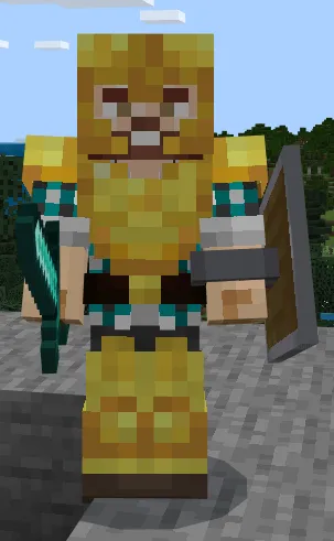 (В Незеритовой броне сохранились алмазы, но теперь они обеспечивают большую защиту лица, запястья теперь являются перчатками, а ботинки стали выше. Также добавлена золотая отделка, отражающая золото, задействованное при их изготовлении.)