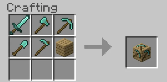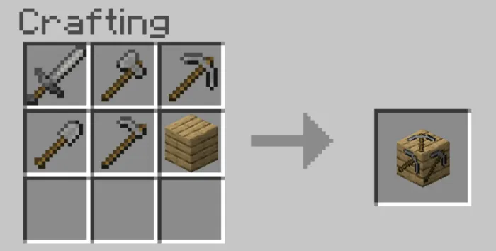 Ящик для инструментов создаётся путём помещения одного меча, топора, кирки, лопаты, мотыги и доски на сетку верстака. Форма не имеет значения при создании, возможны любые типы досок.