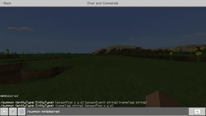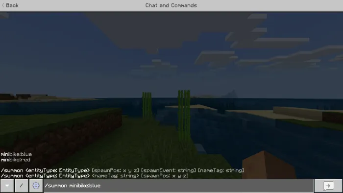 Вы также можете получить минибайк (без яйца призыва), используя команду '/summon minibike:red' или '/summon minibike:blue'.