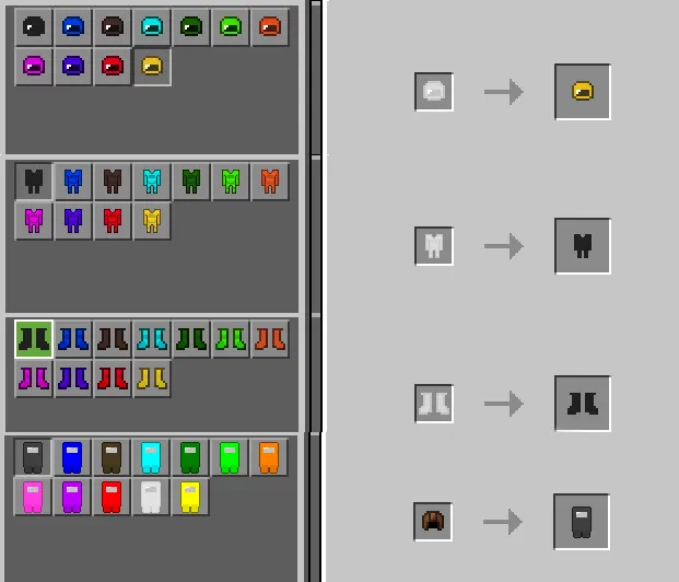 Это дополнение добавляет 12 костюмов, они работают как доспехи, и вы можете сделать белый костюм члена экипажа в режиме выживания, используя этот рецепт: