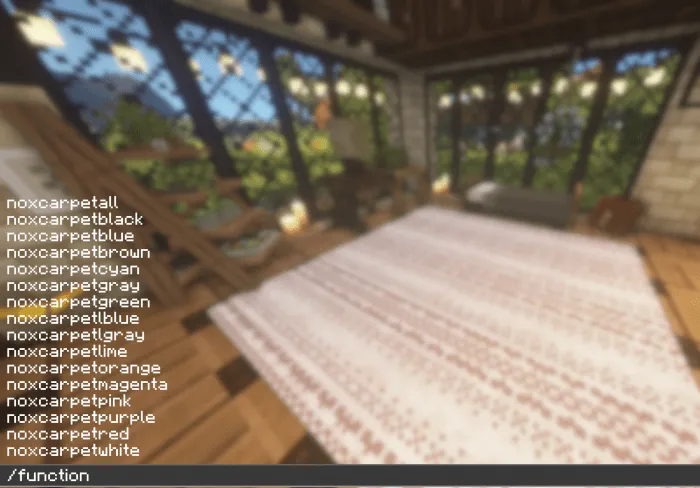 Получить новые ковры в творческом режиме можно с помощью команды - /function noxcarpet[color/all] (вместо 'color' введите параметры с картинки выше; 'all' даст все виды новых ковров).
