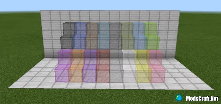 Разноцветные стекла являются особенностью для обычного Minecraft'a на ПК. Этот мод добавляет 16 различных цветных стекл для Minecraft PE. Все они будут доступны через инвентарь творческого режима, или же путем крафта. Также в моде есть и минусы. Например, нет разноцветных оконных окон, и иногда блоки мерцают..