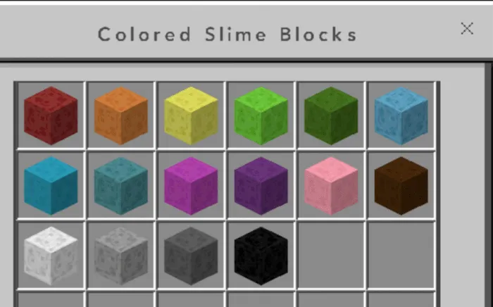 Цветные блоки слизи являются декоративными блоками. Некоторые функции ванильного блока слизи к цветным не применяются. Но Вы наверняка найдете им применение!