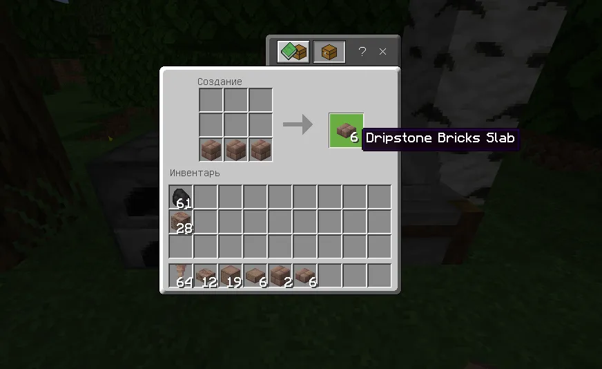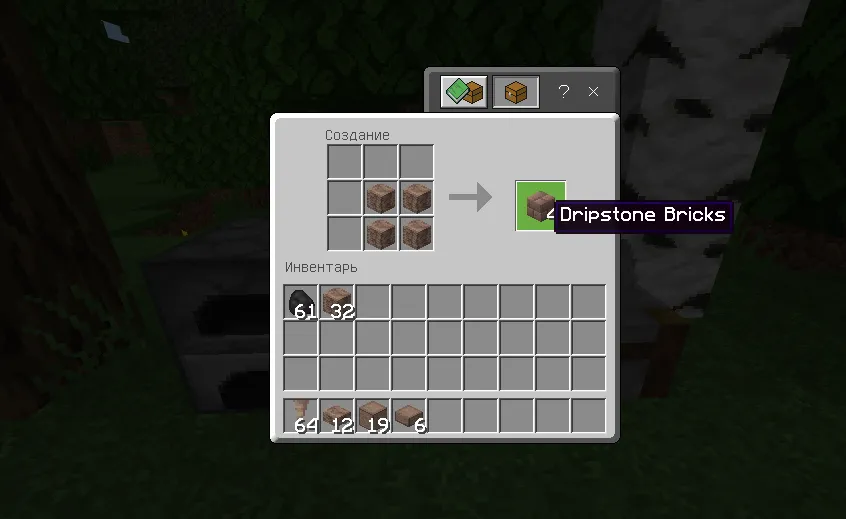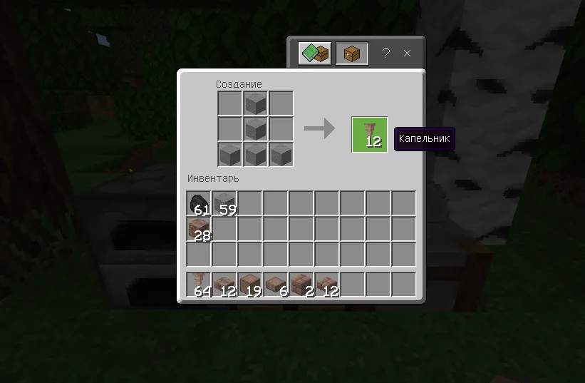 Чтобы создать Капельниковые кирпичи вам понадобится поместить в сетку крафта 2х2 или 3х3 блок Капельника:
