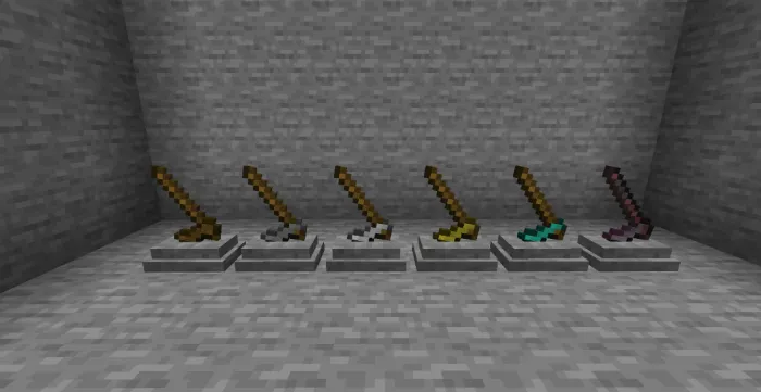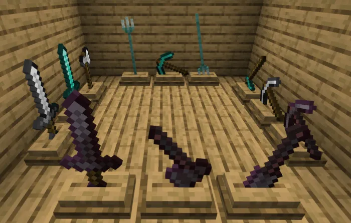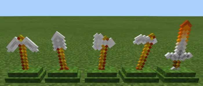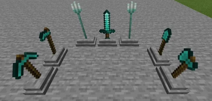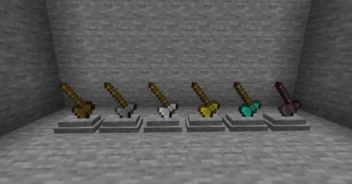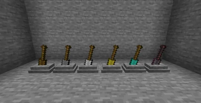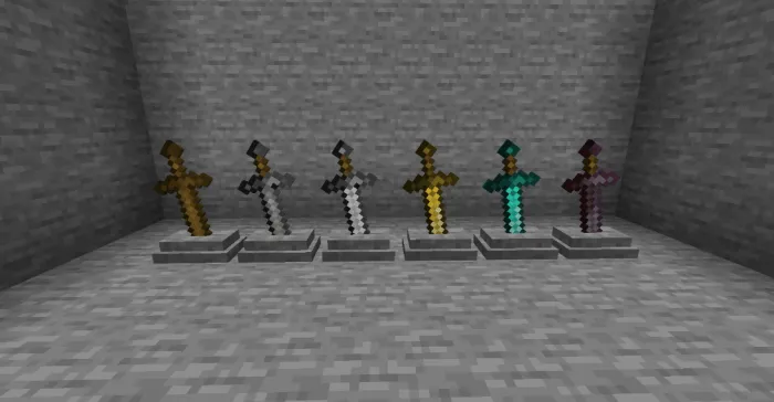 Мод «Weapon Pedestal» создан для игроков, которые хотят показать миру свое лучшее оружие и инструменты. Постаменты следует использовать как декоративные блоки! Работает в выживании, но не с зачарованным снаряжением.