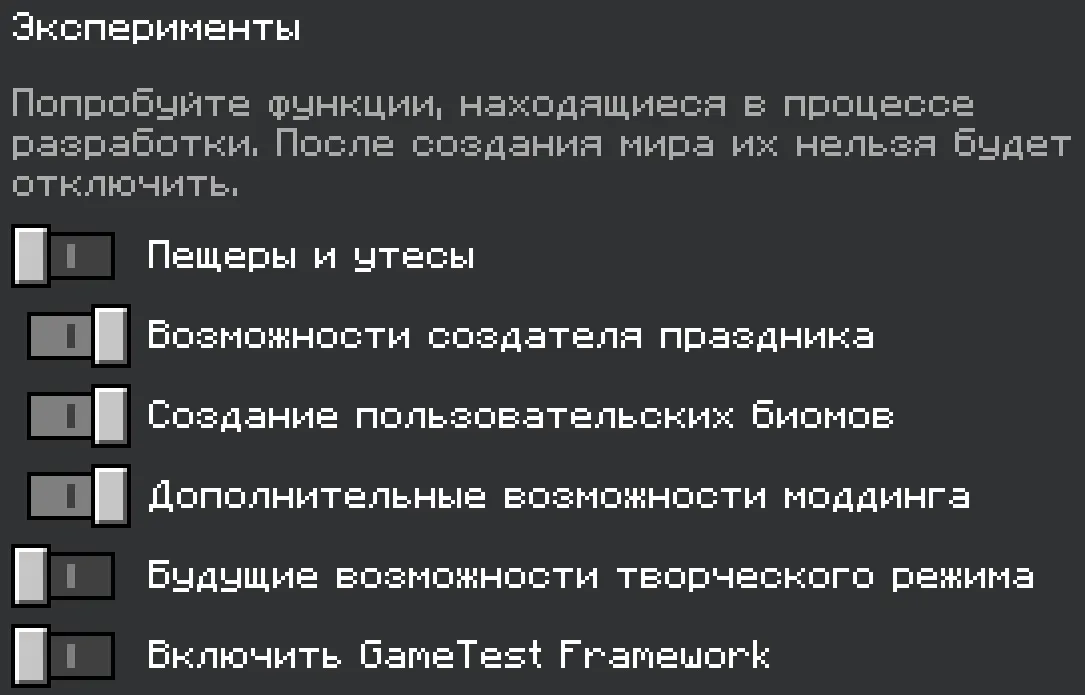 (Примечание: если у вас включён экспериментальный параметр «Пещеры и скалы», эта функция может генерироваться некорректно)