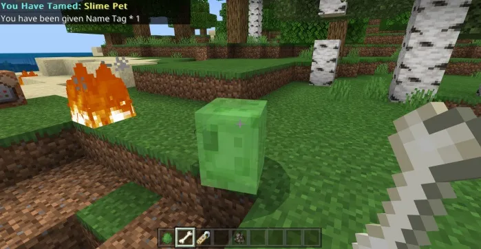 Для приручения используйте железный слиток, после этого вам выдадут бирку для изменения имени питомца.