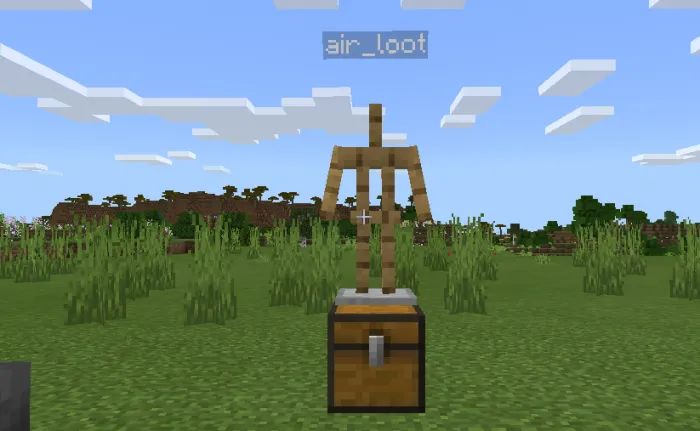 Предметы, содержащиеся в ящиках, не случайны. Вы можете задать определенные предметы, которые всегда будут содержаться в ящиках. Для этого вам понадобится установить сундук, затем сверху на него поставить Стойку для брони с названием "air_loot".