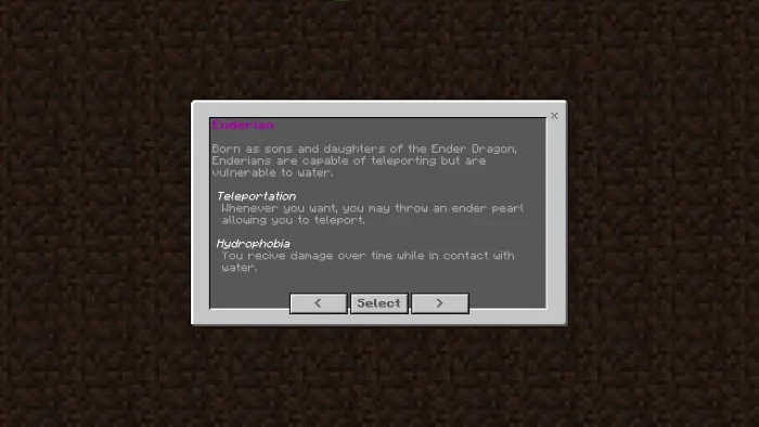 Enderian - возрождаетесь сыном или дочерью Дракона Края. Enderian способен к телепортации и уязвим к воде.