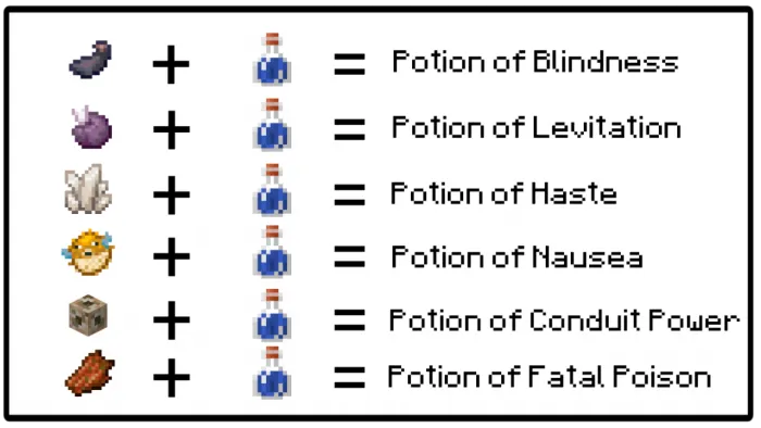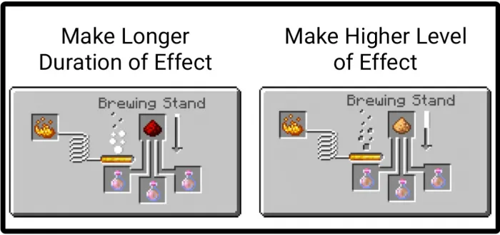 Как и ванильные зелья, эти зелья могут повысить уровень эффекта с помощью светящейся пыли или могут увеличить продолжительность с помощью пыли из красного камня. Эффект слепоты является исключением, этот вид эффекта не имеет более высокого уровня, поэтому вы можете только увеличить его продолжительность.