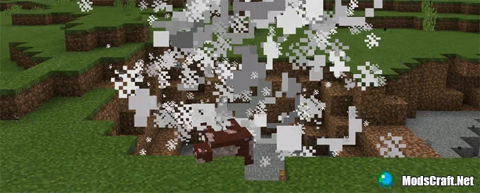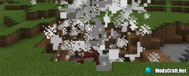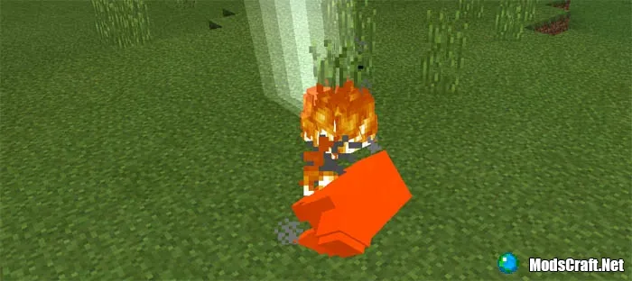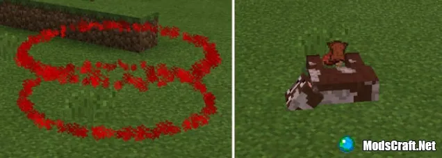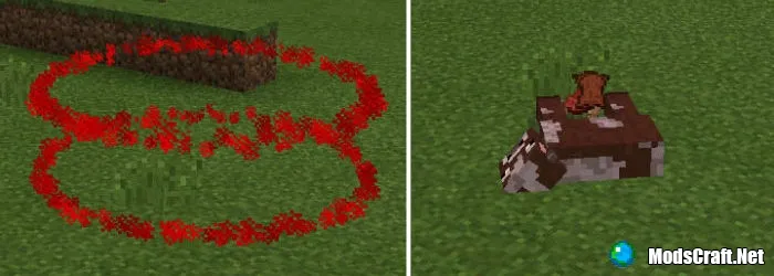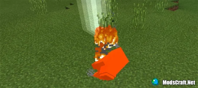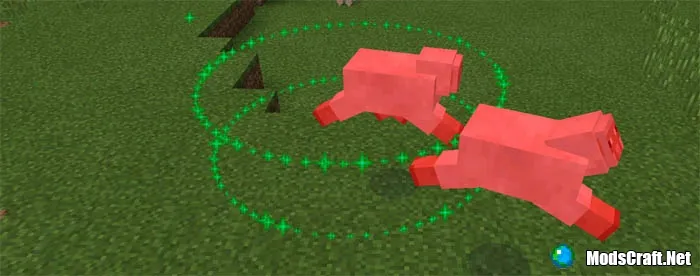 А посох подбрасывания создает красные частицы, которые подбрасывают моба в небо, после чего он падает и умирает.