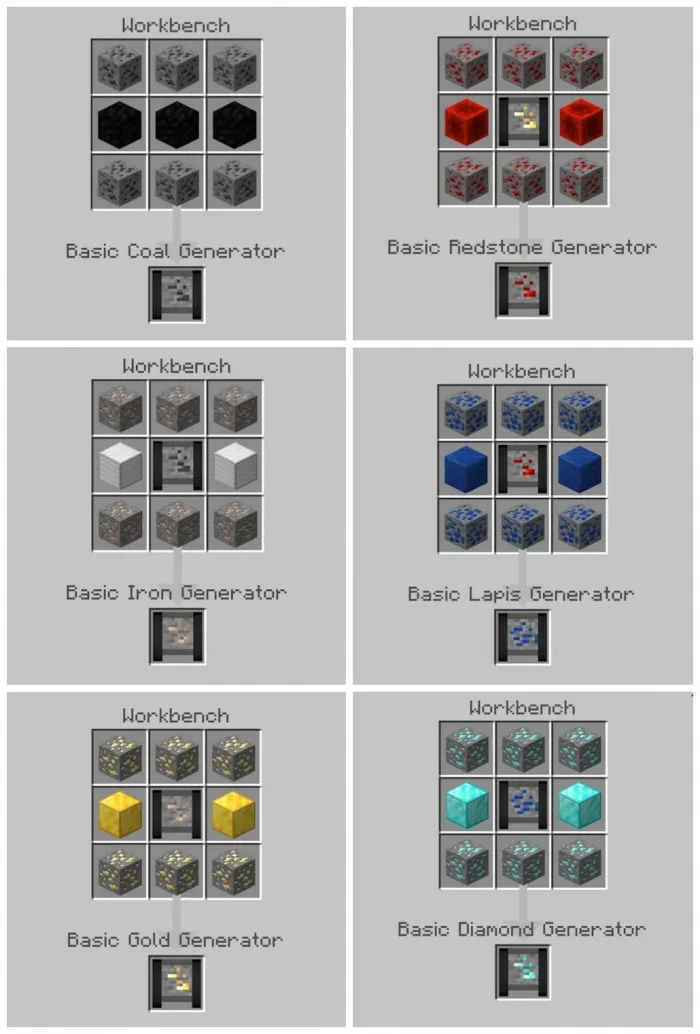 Каждый рецепт крафта генератора требует наличия предыдущего генератора (кроме угольного генератора), например, чтобы создать базовый генератор железа, вам понадобятся 6 блоков железной руды, 2 железных блока и 1 базовый генератор угля и т.д. На картинках ниже изображены рецепты крафтов генераторов в правильном порядке.