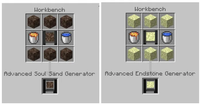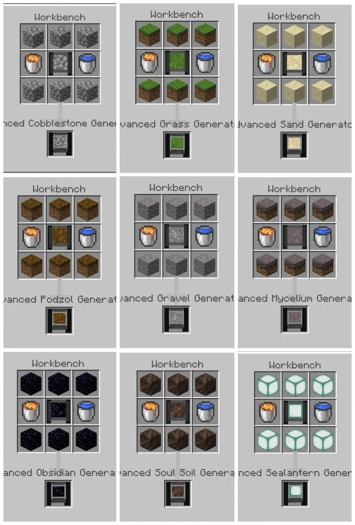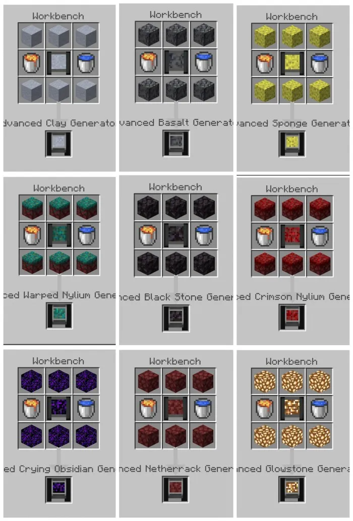 Чтобы создать улучшенный, вам понадобится базовый генератор в качестве основы, например, если вы хотите создать Улучшенный генератор булыжника, вам понадобятся: 1 базовый генератор булыжника, 6 булыжников, 1 ведро лавы и 1 ведро с водой.
