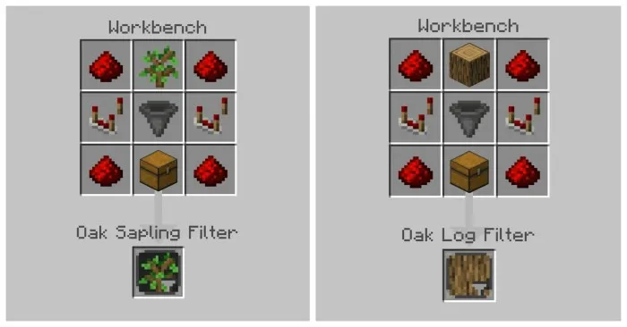 Чтобы создать определенный фильтр, в его рецепте изготовления должны использоваться соответствующие предметы. Например, дубовое бревно используется для изготовления фильтра для дубовых бревен, саженец дуба используется для создания фильтра для саженца дуба и т.д. Все крафты этого дополнения происходят на новом верстаке "Workbench" (создается из ванильного верстака).