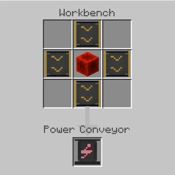 Силовой конвейер питает конвейерную ленту в радиусе 50 блоков в любом направлении. Для его изготовления вам понадобятся 4 конвейера и 1 блок красного камня. Вы можете поставить несколько Силовых конвейеров, чтобы ускорить конвейерную ленту.