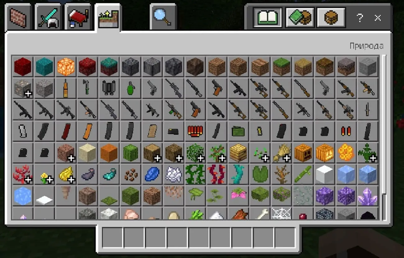 Все предметы, NPC и техника доступны в инвентаре творческого режима.