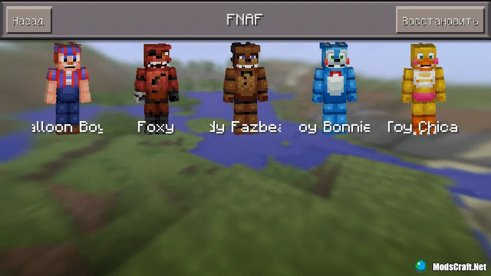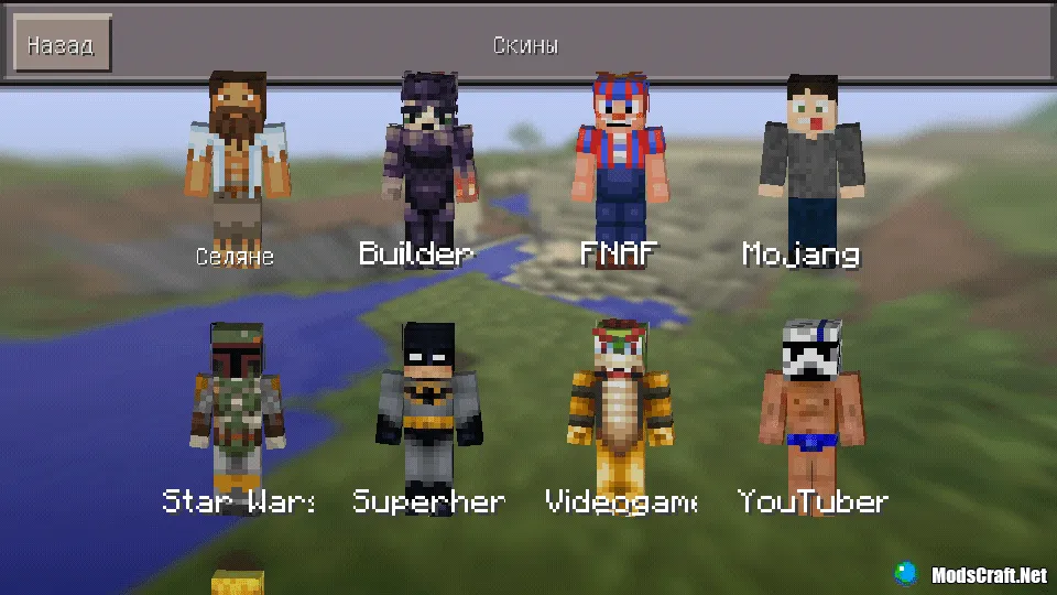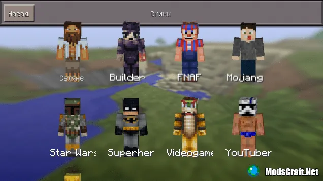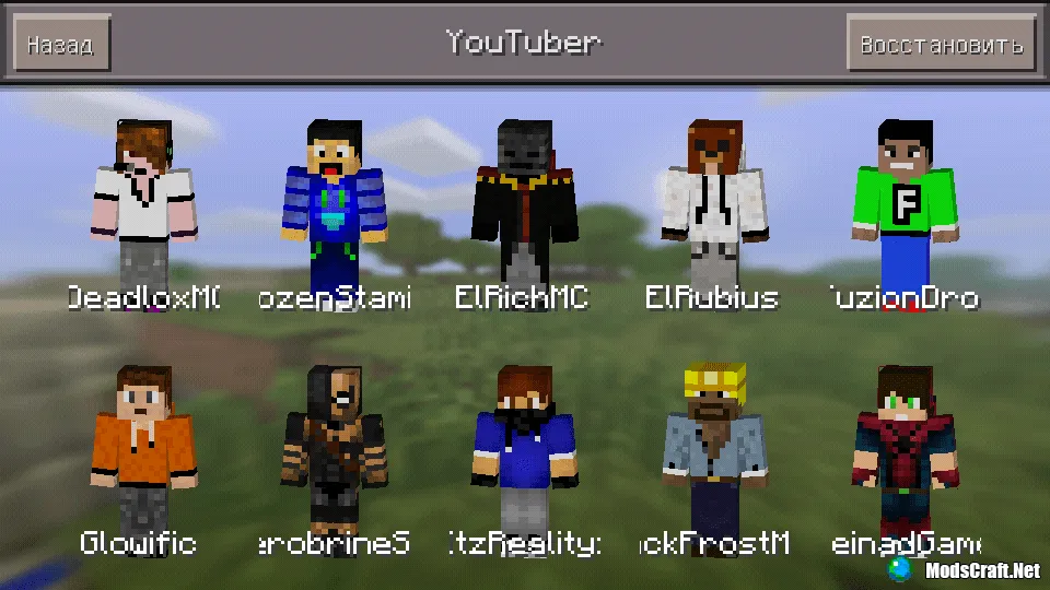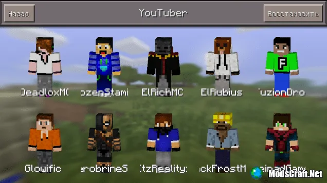 В скинпаке FNAF вы найдёте несколько новых скинов из хоррор-игры Five Nights at Freddy's. А например в скинпаке YouTuber вы найдёте скины популярных зарубежных ютьюберов, в основном это те, кто снимает MC:PE летсплеи и т.п