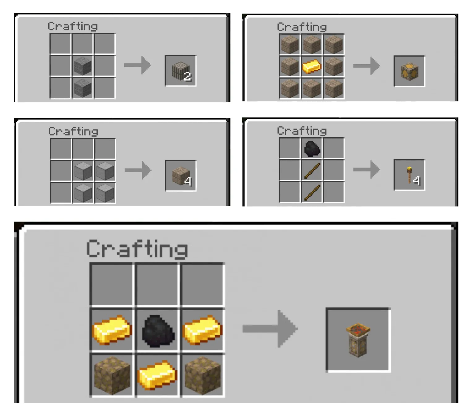 Если вы играете в творческом режиме, вы можете ввести команду /function blocks, чтобы добавить все блоки. Все рецепты крафта: