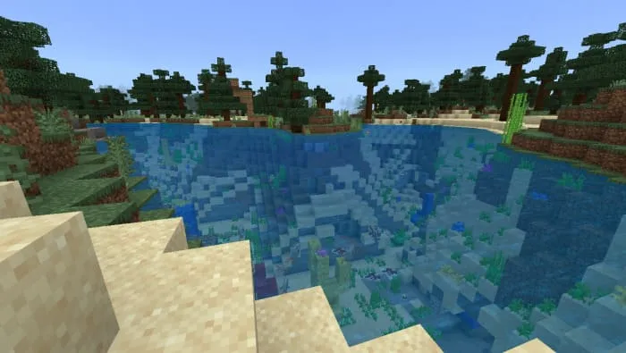 Аддон «Улучшенные реки» добавит в реку тёплый океан с его содержимым: кораллами, песком и тропическими рыбами.