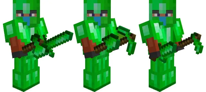 Изумрудный топор: 6 урона, 836 прочности, 7 скорости. Алмазный топор: 6 урона, 1561 прочность, 8 скорость.