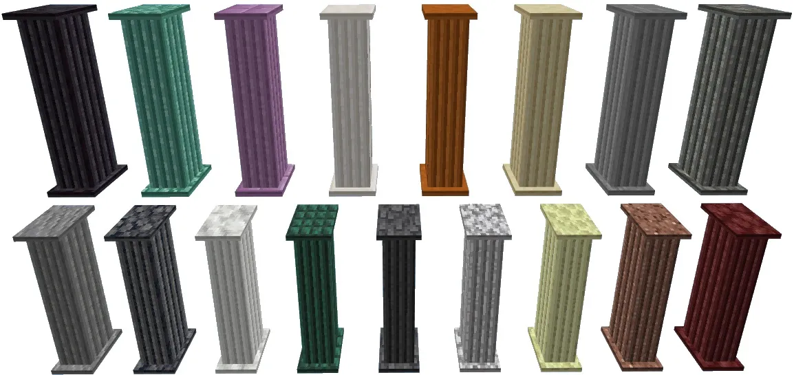 Мод Pillars добавляет 17 новых разнообразных блоков колонн в ваш мир Майнкрафт! Благодаря колоннам и различным комбинациям из них вы сможете создавать новые уникальные постройки.