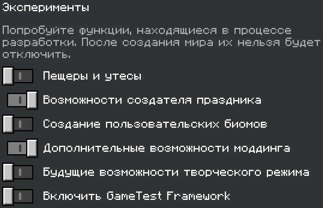 Обязательно включите две экспериментальные настройки для правильной работы мода.