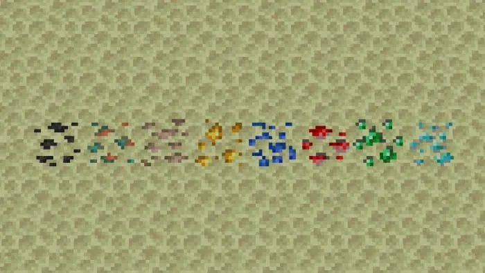В этом измерении будут генерироваться 8 новых блоков: уголь, медь, железо, золото, лазурит, красный камень, изумруд и алмазная руда. Все блоки появляются немного чаще, чем их аналоги в других измерениях.