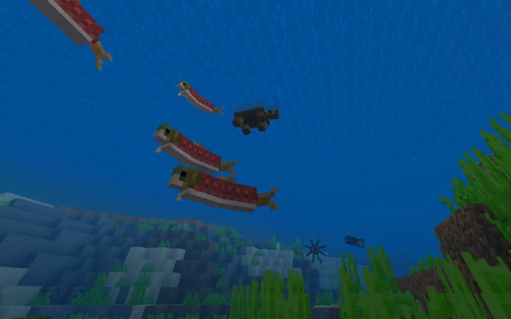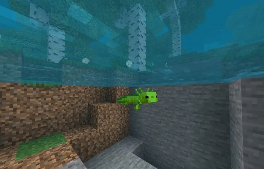 Теперь вы сможете встретить зелёных аксолотлей, но они не умеют размножаться и при виде утопленников начинают убегать.