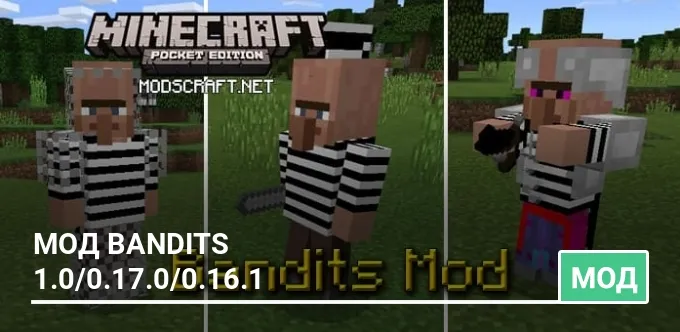 Мод Bandits добавит в Minecraft Pocket Edition несколько различных бандитов. Это действительно крутой мод МКПЕ, если вы хотите добавить в игру еще больше сложности. Но стоит отметить, что не все они злые. Например, бандит панк может помочь вам в борьбе с другими бандитами.