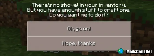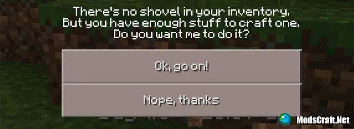 Это очень полезно, поскольку если вы нажмёте на "Ok", то мод автоматически скрафтит за вас лопату, если у вас в инвентаре есть нужные вещи для её крафта.