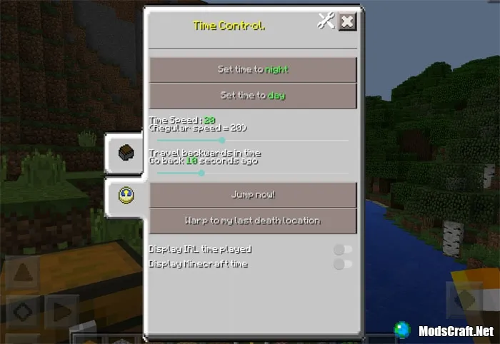 В меню управлении временем “Time Control” вы также можете включить опции Display IRL time played” / “Display Minecraft time”, которые будут показывать время, которое вы провели в игре и игровое время Minecraft.