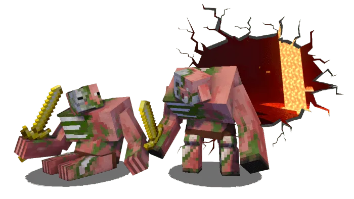 Свинозомби и Зомбифицированный пиглин-мутант: эти мобы имеют 150 единиц здоровья и нейтральны к игрокам. Нападают только в том случае, если кто-либо нападает на них. Они способны ходить по лаве и призывать гораздо более сильных миньонов, которые живут около 20 секунд.