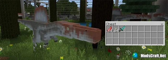 Прирученный Спинозавр имеет специальный сундук (27 слотов), в котором можно хранить вещи.