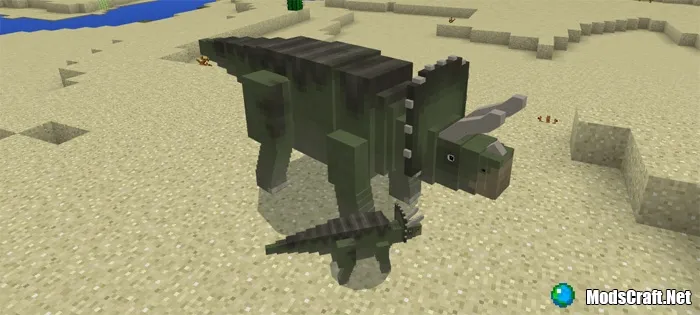 Трицератопс: это крупный четвероногий динозавр. Он имеетбольшой костяной воротник и три рога. Это нейтральный моб, который будет пытаться избежать больших динозавров, но если его спровоцировать, он будет защищать себя и своих детенышей против злонамеренных игроков и враждебных динозавров.