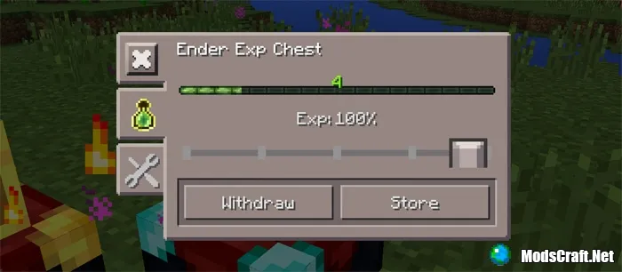 Поместите его на землю и тапните по нему, чтобы открыть специальный интерфейс. Используйте ползунок, чтобы установить процент опыта, который Вы хотите положить в сундук. В этом случае я установил его на 100%. Кнопка Store заберёт у Вас опыт, а кнопка Withdraw вернет его Вам.