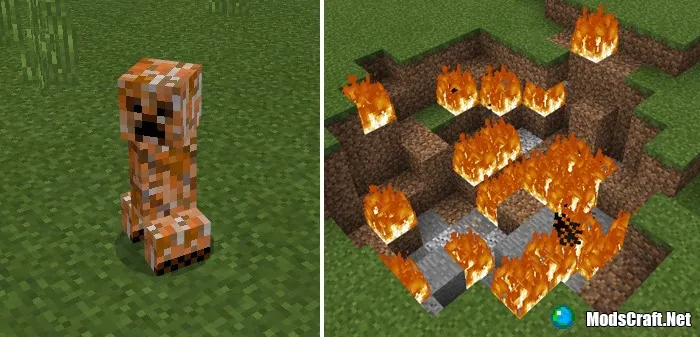Огненный крипер (заменяет крипера) после взрыва оставляет огненный след, а сам взрыв немного мощнее.