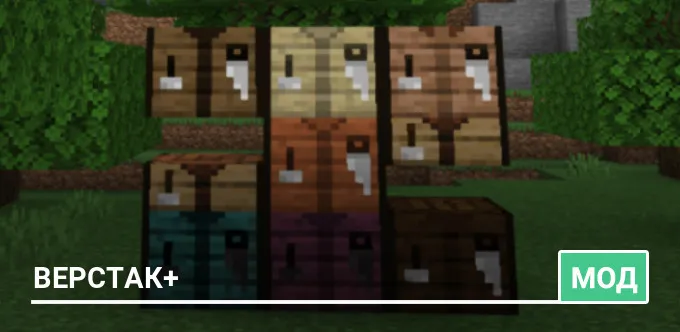 «Crafting Tables+» добавляет 9 новых верстаков, 7 для каждого вида дерева и 2 в форме плиты и стены для украшения ваших домов.