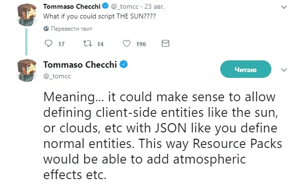 "Ну перенесут они, а мне какой толк от этого?" - в этом есть смысл. Ведь сейчас в игру нельзя добавить свой собственный рецепт блока или предмета. А вот анимации и прочие вещи мобов будут полезны создателям карт и дополнений, чтобы полностью изменить поведение существа.