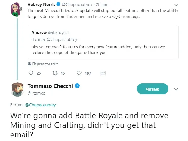 Томми даже в шутку написал в своем твиттере "мы собираемся добавить королевскую битву, удалив крафтинг и шахтерство". Надеемся, что это действительно лишь шутка