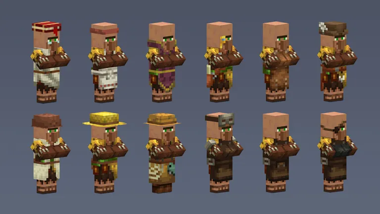 Верхний ряд слева направо: библиотекарь, мясник, священник, картограф, кожевник и лучник. Нижний ряд слева направо: пастух, фермер, рыболов, оружейник, инструментальщик и кузнец.