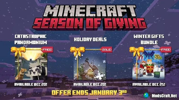 В магазине Minecraft Bedrock Edition начался ежегодный сезон Дарения Подарков. Заходите в магазин игры и забирайте свой новогодний подарок уже прямо сейчас!