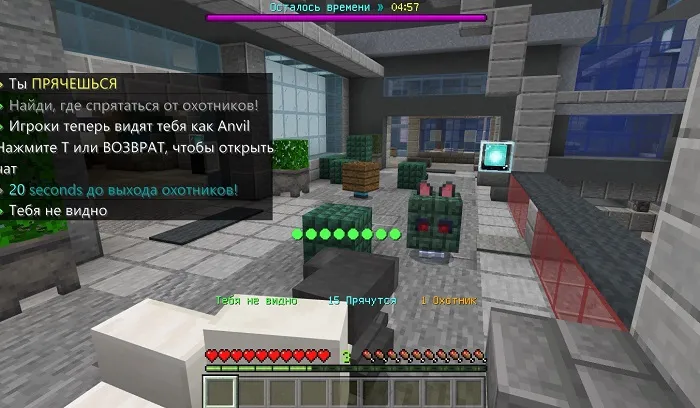 Например, на сервере The Hive есть великолепный режим Hide and Seek, в котором игроки делятся на прячущихся и охотников — прячущимся нужно быстро искать места, в которых охотники не смогут их отыскать.