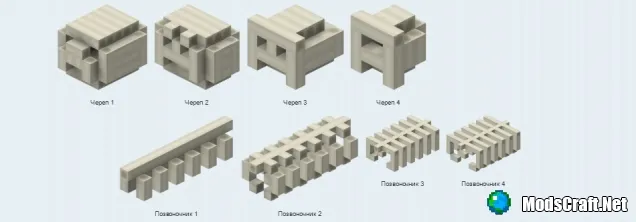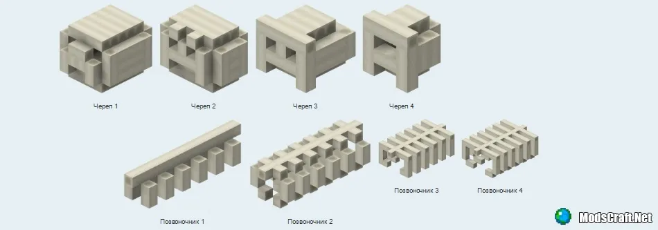 Ископаемые останки - структуры, которые генерируются под землёй в некоторых биомах. Имеют форму черепа и позвоночника. Быть может это останки какого-то огромного монстра? При этом любой костяной блок может быть заменён угольной рудой.
