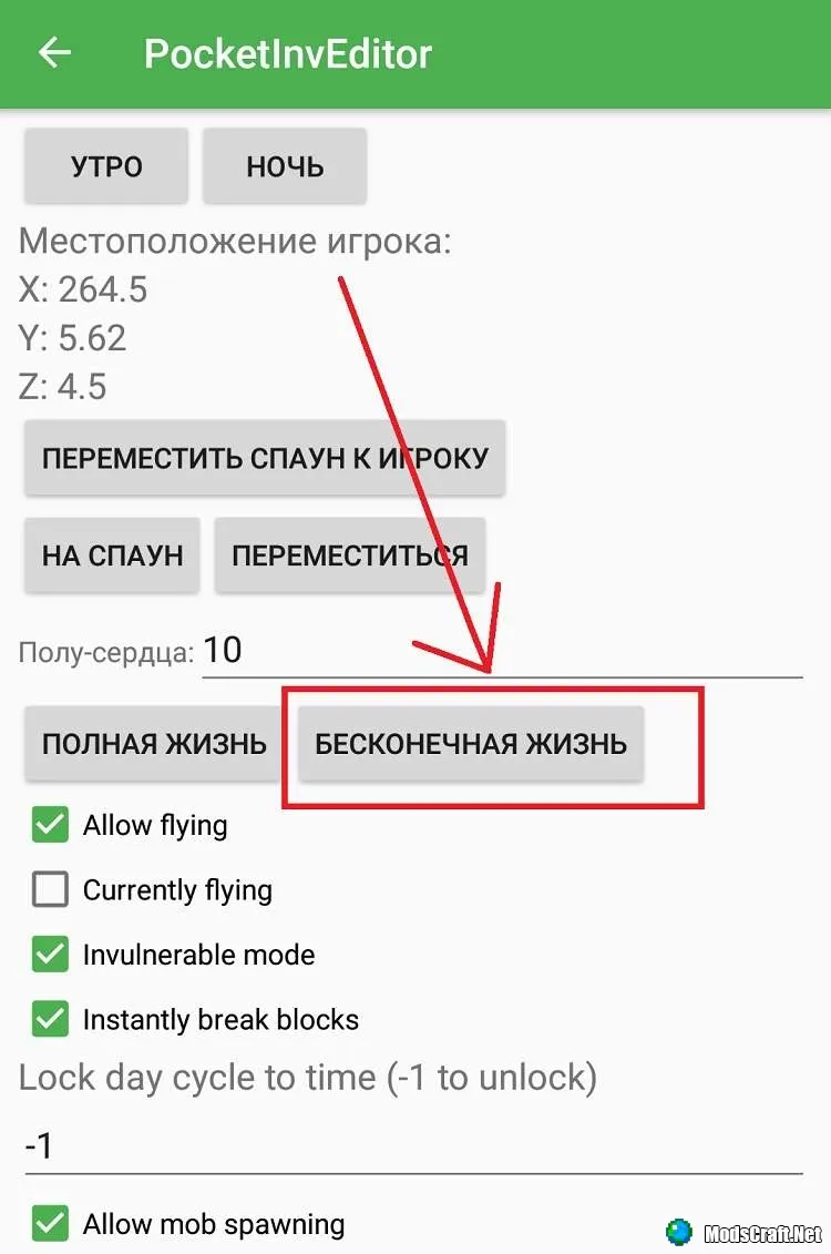 PocketInvEditor - это одна из самых популярных программ для Minecraft Pocket Edition, которая позволяет редактировать инвентарь и мир. Кроме того, с помощью данной программы Вы сможете устанавливать себе бесконечное здоровье, узнавать и изменять координаты местоположения, редактировать точку спауна и многое другое!
