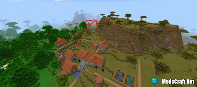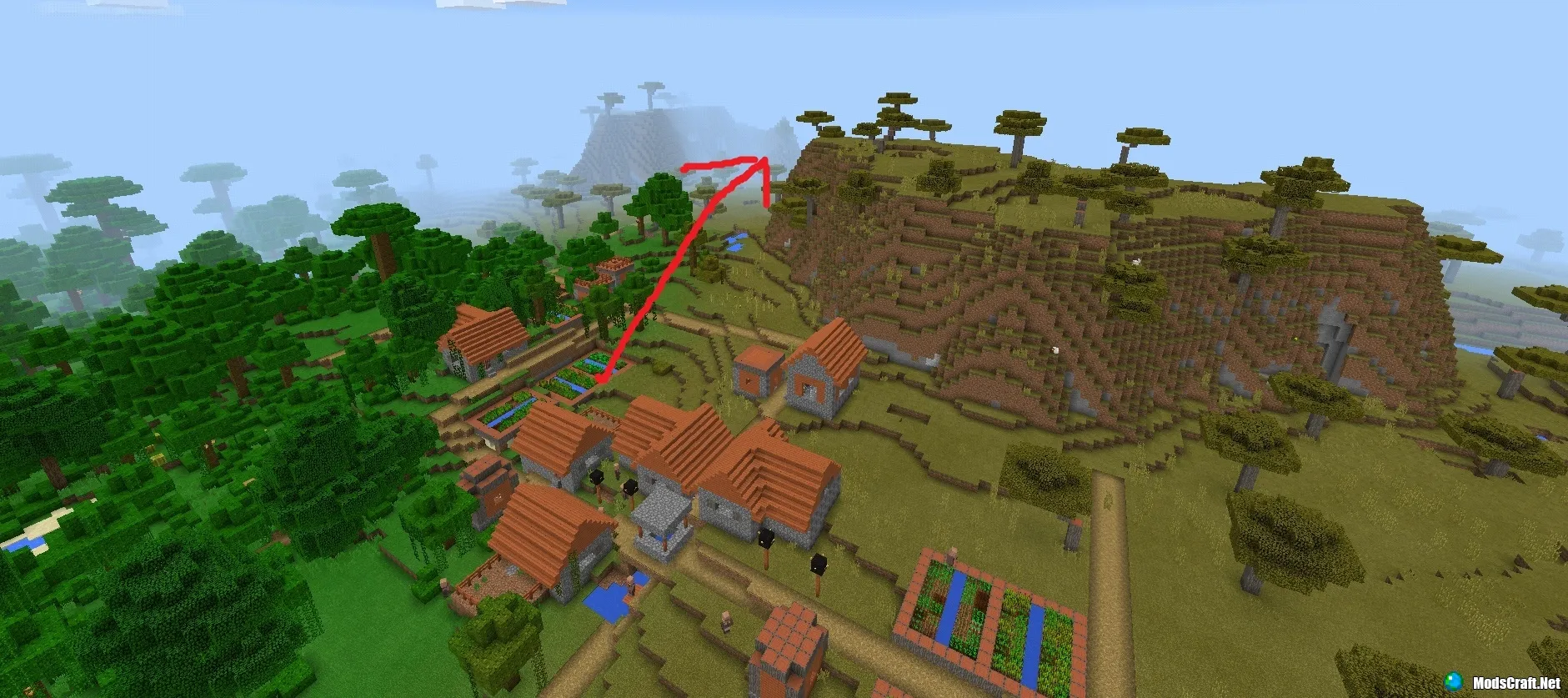 С этим сидом для Minecraft Pocket Edition вы сможете попасть в биом Саванна, в котором возле спауна находится деревня, а недалеко от неё расположилась ещё и вторая деревня, в которой есть кузница с сундуком.