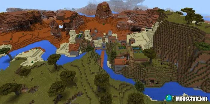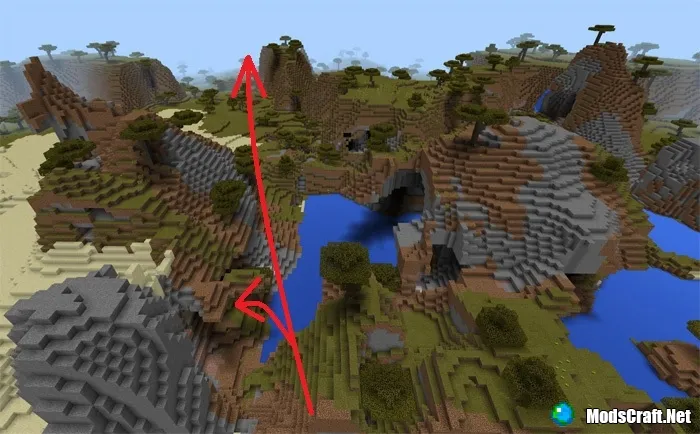 Вскоре вы доберетесь до реки, которая отделяет биом саванны и Мезы. Переплывите реку, чтобы добраться до деревни Мезы. (Координаты: 2298, 71, -439)